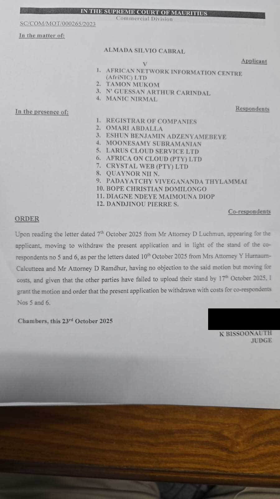 AFRINIC v Cloud Innovation Ltd ipo the Official Receiver SCR No1808 6B/65/2023 |